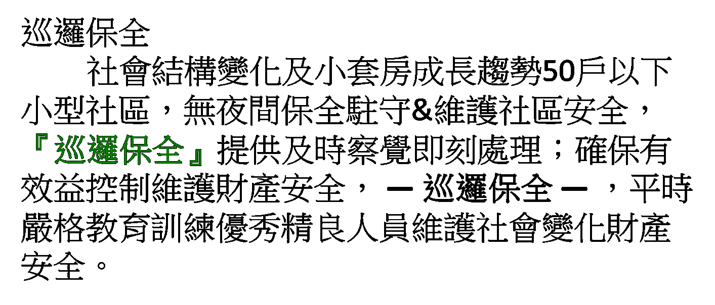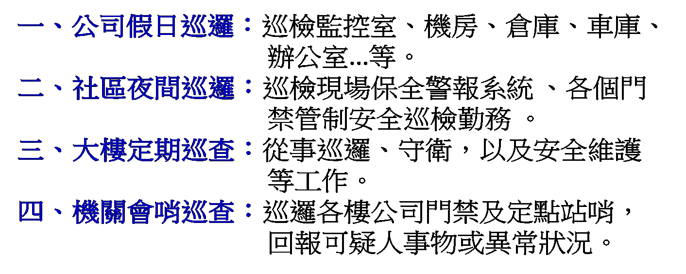公司假日保全 、 社區夜間保全 、 廠區安全保全 、 機關會哨保全 |